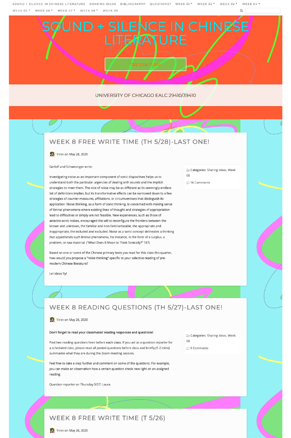 I taught “Sound and Silence in Chinese Literature” first at the University of Chicago in an online format in Spring 2020, and it was very successful. I am excited about offering a revised version of this class at Dartmouth College in Summer 2026. This class introduces a wide range of literary texts from both premodern and modern China as well as key theoretical texts in sound studies. An exercise key to the class is what I call “short-circuit thinking”—creating productive connections and conversations between texts and ideas produced by different historical and cultural contexts.